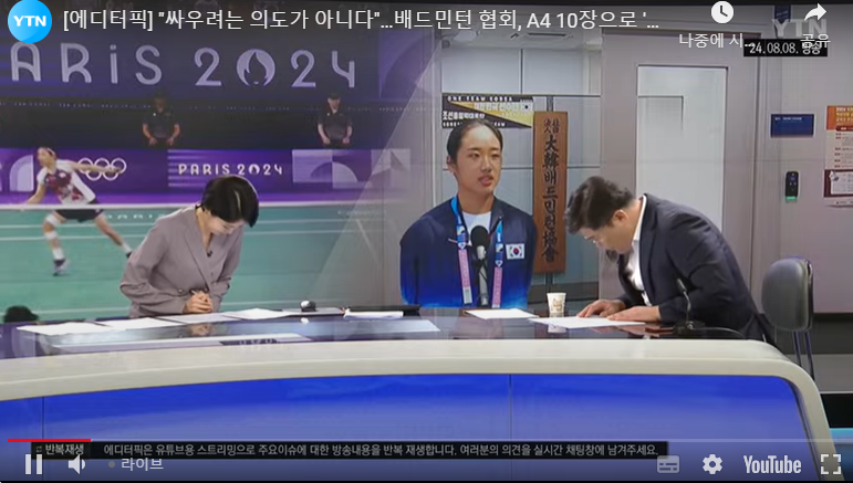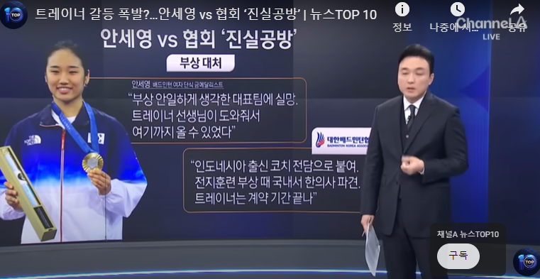 - (경기력 관리를 위해) 개인 트레이너를 쓰고 싶다”는 안세영의 의견이 묵살됐다는 데 대해서는 “협회로 공식적으로 전달된 바 없다”라고 선을 그었다.