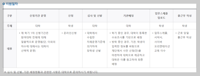 - 근로대기 단계 변경: 신청이 완료되면 각 대학에서 자체 운영 기준에 따라 장학생을 선발합니다. 이후 근로기관 배정이 이루어집니다.