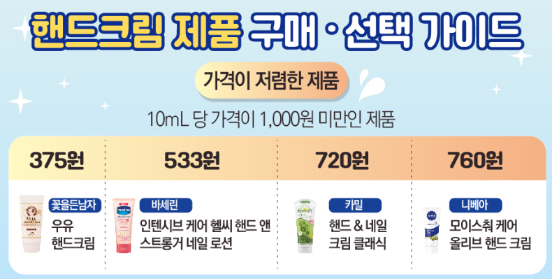 우유 핸드크림이 가장 저렴하며, 보습력도 우수해 경제적인 선택으로 추천할 수 있습니다.