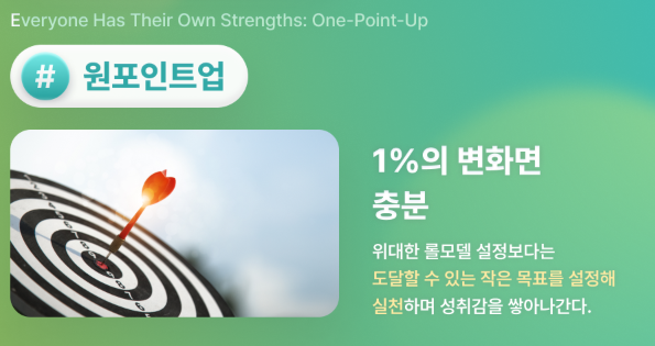 원포인트업은 'Everyone Has Their Own Strengths: One-Point-Up'의 약자로, 각 개인이 가진 고유한 강점을 한 가지씩 발전시키는 자기 계발 전략입니다. 이는 자기 자신을 통째로 바꾸려 하지 않고, 한 가지씩 천천히 변화해 나가자는 의미를 담고 있습니다. 즉, 여러 가지 목표를 세우고 다 실천하지 못해 실패하는 것보다, 현재의 나에게 맞는 한 가지 목표를 설정하고 이를 실천하는 것이 중요하다는 것입니다.