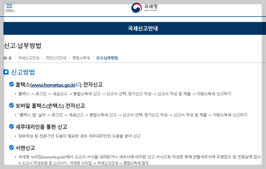 홈택스 → 로그인 → 세금신고 → 종합소득세 신고 →