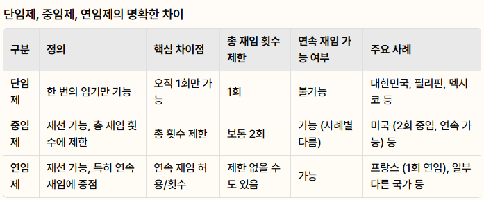| 단임제 (Single Term System): 한 번의 기회 중임제 (Re-election Limit System): 총 재임 횟수 제한 연임제 (Consecutive Re-election System): 연속 재선 가능 요점 정리 결론: 어떤 제도가 최선인가? |