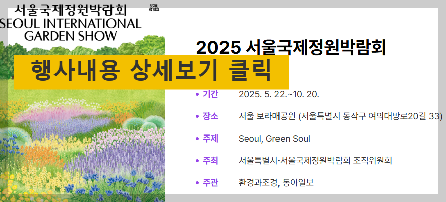 드디어 기다리고 기다리던 2025 서울국제정원박람회가 문을 열었습니다! 정원을 워낙 좋아하는 저에게 이번 박람회 소식은 정말 반가웠는데요. '서울, 그린 소울'이라는 주제로 보라매공원에서 10월 20일까지 길게 열린다는 소식에 서둘러 다녀와 보았습니다. 서울 가볼 만한 곳을 찾고 계신 분들께 꼭 추천해 드리고 싶은, 싱그러움 가득했던 현장 후기를 들려드릴게요!