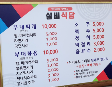 1965년에 문을 연 실비식당은 독창적인 양념 레시피로 특별한 부대찌개와 부대볶음을 선보이는 곳입니다. 부대찌개와 부대볶음 모두 1인분 주문이 가능하며, 치즈떡사리를 추가해서 먹으면 더욱 맛있다는 평이 있습니다. 흥선역에서 약 800m 거리에 있습니다.
