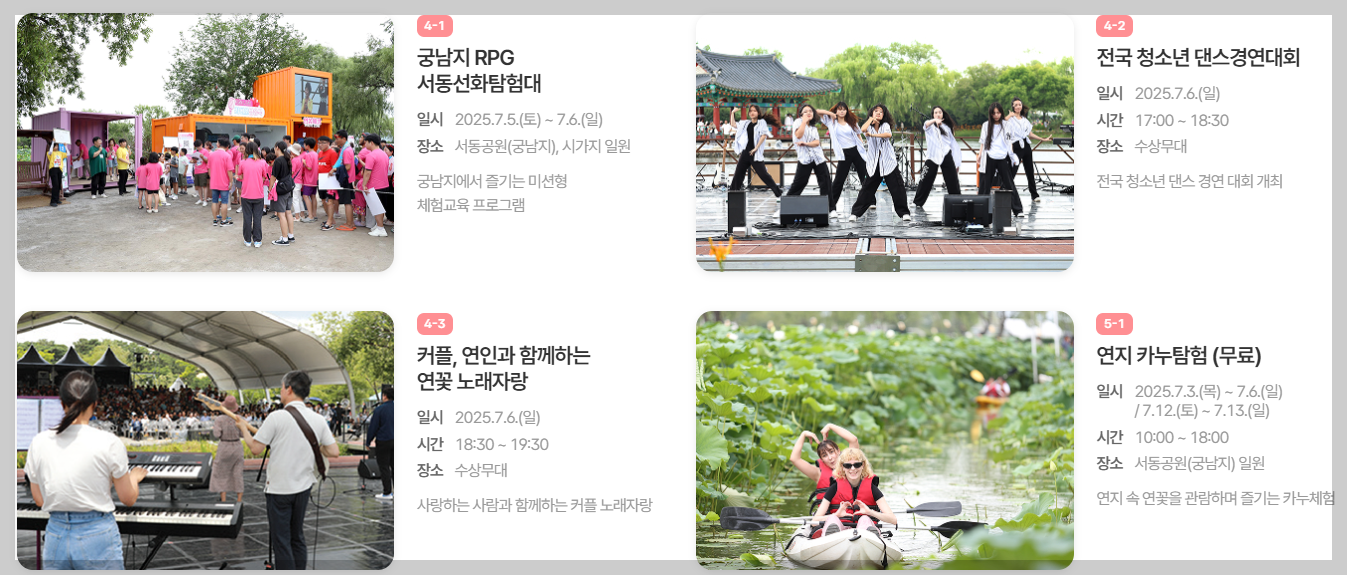 KBS 찾아가는 음악회, 궁남지 힙합 Festival, 궁남지 사랑연가 등 다양한 장르의 공연이 준비되어 있으며, 부여청소년오케스트라 공연과 핑크퐁과 함께하는 연꽃축제는 가족 단위 방문객에게 특히 인기가 많습니다. 또한, 궁남지 RPG-서동선화탐험대, 청소년 댄스경연대회, 부여 커플 노래자랑 등 참여형 경연 프로그램도 즐거움을 더합니다.