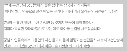 - 편안한 신발 착용: 궁남지 일원이 넓으니, 편안한 신발을 착용하고 여유롭게 산책하며 연꽃을 감상하시는 것을 추천합니다.