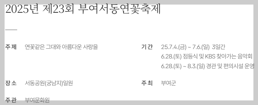 축제는 2025년 7월 4일(금)부터 7월 6일(일)까지 3일간 진행되며, 부여읍 동남리에 위치한 궁남지 일원 축제 장소에서 무료로 개최됩니다.
