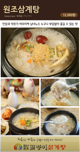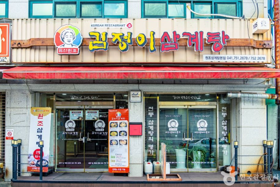 금산원조 김정이삼계탕은 충남 금산군 금산읍 인삼약초로에 위치한 삼계탕 전문점입니다. 금산인삼시장에서 직접 구매한 신선한 인삼을 사용하여 삼계탕을 끓여내며, 대추, 천궁 등 다양한 한약재와 닭을 함께 넣어 1시간 동안 정성껏 끓여낸다고 합니다. 지역 주민들은 물론, 금산인삼시장을 찾는 상인과 손님들에게 오랫동안 사랑받아온 곳이죠. 140석 규모로 넓고 쾌적하며, 메뉴판도 한국어, 영어, 일본어, 중국어로 제공되어 외국인 방문객에게도 편리합니다.