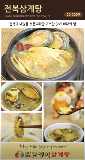다음으로 맛본 것은 특전복삼계탕입니다. 인삼과 닭의 조화에 신선한 전복까지 더해져 바다의 기운까지 느낄 수 있는 메뉴였습니다. 쫄깃한 전복의 식감과 삼계탕 국물의 깊은 맛이 어우러져 더욱 풍부한 맛을 선사했습니다. 특히 전복은 별미 중의 별미로, 씹을수록 고소한 맛이 입안 가득 퍼져 정말 만족스러웠습니다. 평소 해산물을 좋아하신다면 특전복삼계탕은 탁월한 선택이 될 것입니다.