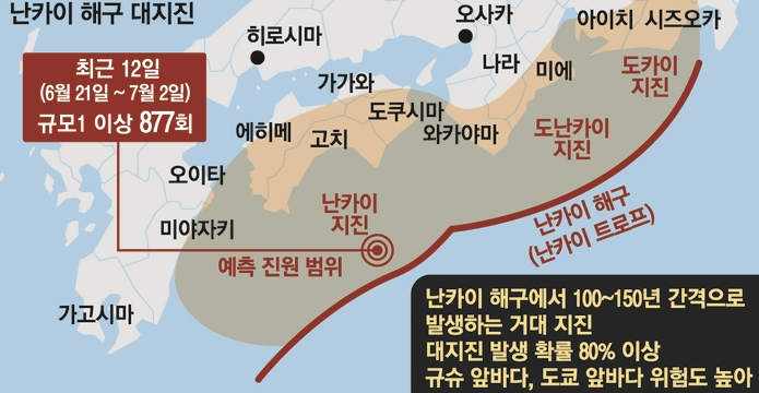 - **규슈 동부 해안 지역**: 미야자키현, 오이타현 등도 난카이 트로프의 영향권에 있어 피해가 우려됩니다.