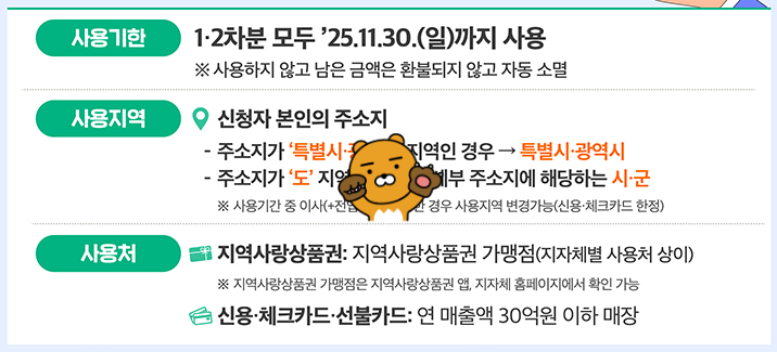 - 사용 지역: 주소지 관할 지방자치단체 내에서만 사용 가능합니다. (예: 서울 시민은 서울 내, 경기도민은 해당 시·군 내)