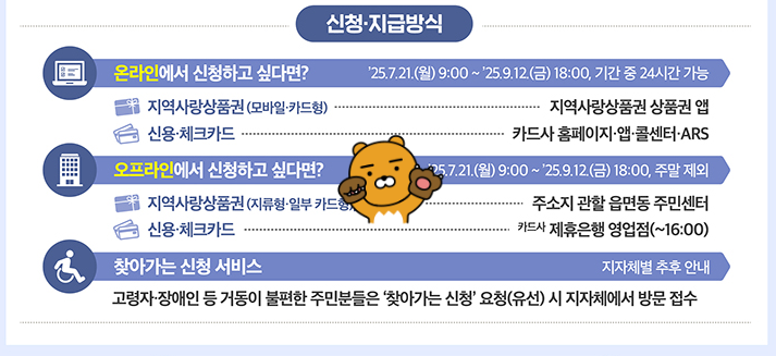 신청은 오는 7월 21일 오전 9시부터 9월 12일 오후 6시까지 진행됩니다. 신청 방식은 크게 온라인과 오프라인으로 나뉘며, 신용·체크카드, 선불카드, 지역사랑상품권 중 원하는 방식을 선택할 수 있습니다.
