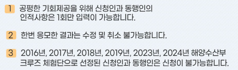 - 그동안 해수부가 운영한 크루즈 체험단에 선정되었던 분들은 이번에는 참가할 수 없습니다.