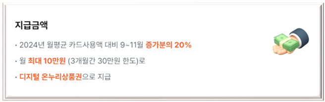 - 지급 금액: 2024년 월평균 카드 사용액 대비 9~11월 증가분의 20% (월 최대 10만 원, 3개월간 최대 30만 원 한도)
