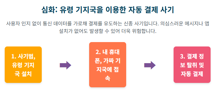 이 수법은 사기꾼들이 휴대폰 신호를 가로채는 소형 기지국(일명 유령 기지국)을 설치해 악성코드를 배포하는 방식입니다. 사용자가 특별한 행동을 하지 않아도 해당 기지국에 연결되는 순간 스마트폰에 악성 앱이 설치되고, 개인정보를 탈취해 소액결제를 감행합니다. 최근 특정 통신사에서 대규모로 발생했던 사기 사건이 이 유형에 속합니다.