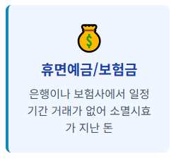 - 휴면예금/휴면보험금: 은행이나 보험사에서 일정 기간 거래가 없어 소멸시효가 지난 돈.