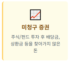 - 미청구 증권: 주식이나 펀드 투자 후 배당금, 상환금 등을 찾아가지 않은 돈.