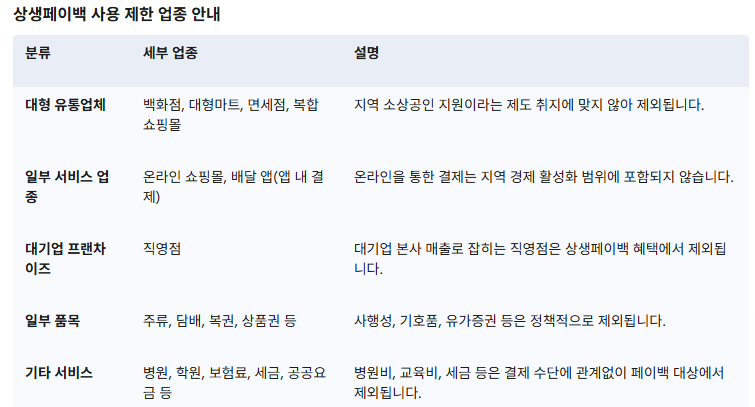 상생페이백은 지역경제 활성화를 위한 제도이므로, 대형 유통업체나 온라인 결제는 대부분 제외됩니다. 아래 목록을 꼭 확인하고 소비를 계획하세요.