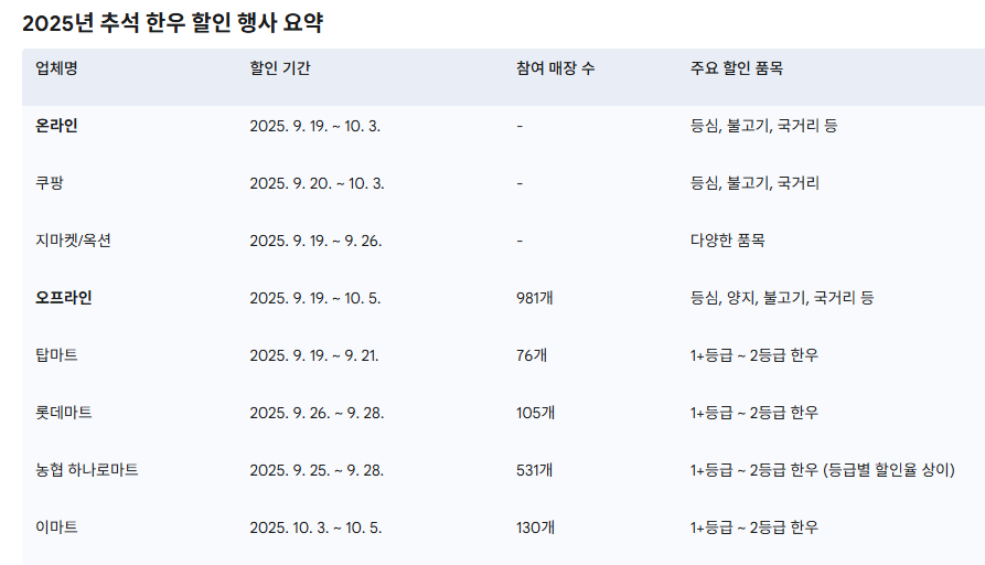 - 온라인 쇼핑몰로는 쿠팡이 9월 20일부터 10월 3일까지 등심, 불고기, 국거리를 할인 판매하며, 지마켓/옥션은 9월 19일부터 9월 26일까지 다양한 품목을 할인합니다.