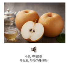 - 배: 수분이 많아 건조한 목을 보호하고, 루테올린 성분이 기침과 가래를 완화하는 데 도움을 줍니다.