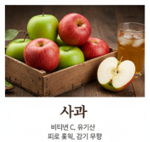 - 사과: 비타민 C와 유기산이 풍부하여 피로 회복과 감기 예방에 좋습니다.
