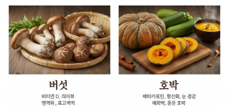 - 버섯: 비타민 D와 식이섬유가 풍부해 면역력 강화에 효과적입니다. 특히 가을에 나는 송이버섯이나 표고버섯은 맛과 영양이 뛰어납니다.