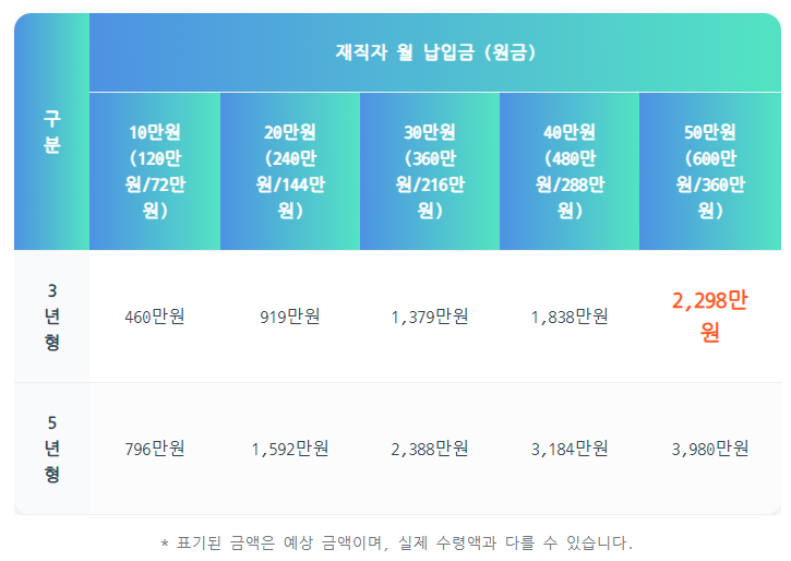 - 만기 수령액: 2,298만원 (개인 납입금 + 이자 + 기업 지원금 포함)