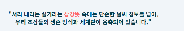 - 건강 관리의 중요성: 서리 내리는 찬 기운은 면역력 관리에 대한 경고이기도 합니다. '상강' 시기에 전통적으로 보양식을 먹거나 몸을 따뜻하게 했던 풍습은 환절기 건강 관리의 중요성을 일깨웁니다.