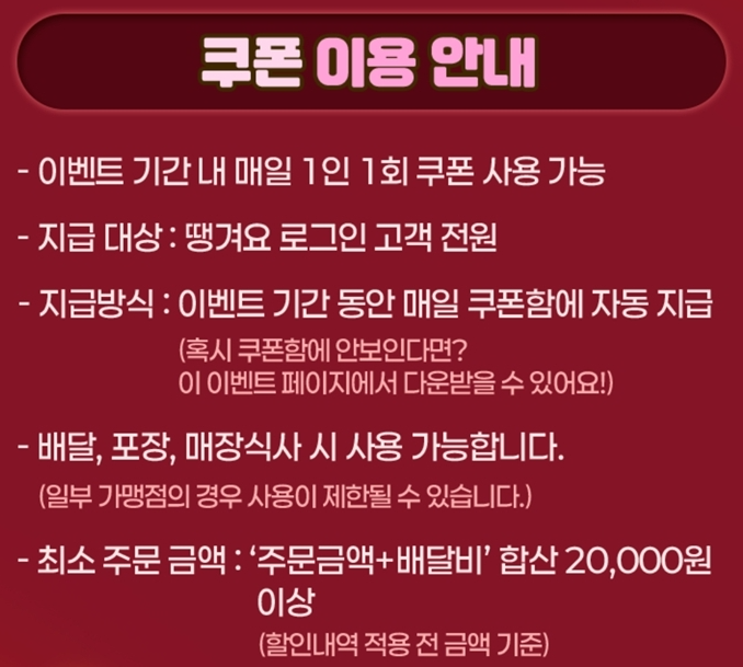 - 매일 1회만 발급 및 사용 가능하며, 최소 주문 금액 2만원을 충족해야 합니다.