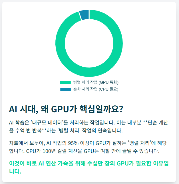 따라서 AI에게는 똑똑하지만 느린 **만능 반장(CPU)**보다, 빠르고 많은 **병렬 일꾼(GPU)**이 절대적으로 필요합니다. 이것이 바로 GPU가 AI 시대의 핵심이 되었고, 한국이 **GPU 26만장** 확보에 국가 역량을 집중하는 이유입니다.