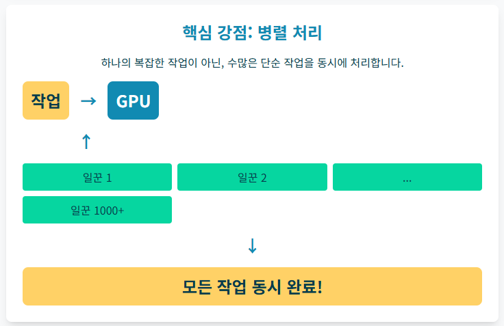GPU 안에는 수천 개의 작은 코어(일꾼)가 들어있어, 복잡한 문제 해결 능력은 떨어지지만 **아주 단순하고 반복적인 일**을 동시에, 한꺼번에 붙어 처리하는 능력에서 CPU를 압도합니다.