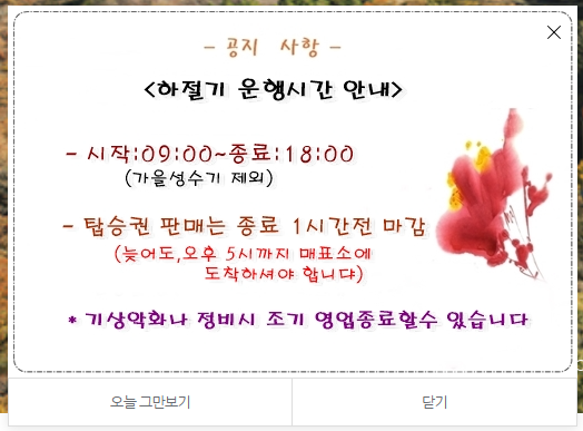 - 일반 운영 시간: 08:00 ~ 17:00 (성수기 18:00까지 연장 가능)