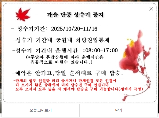 단풍 성수기에는 운영 시간이 연장되거나 변동될 수 있습니다. 현장 상황 및 국립공원 공지사항을 꼭 확인하세요.