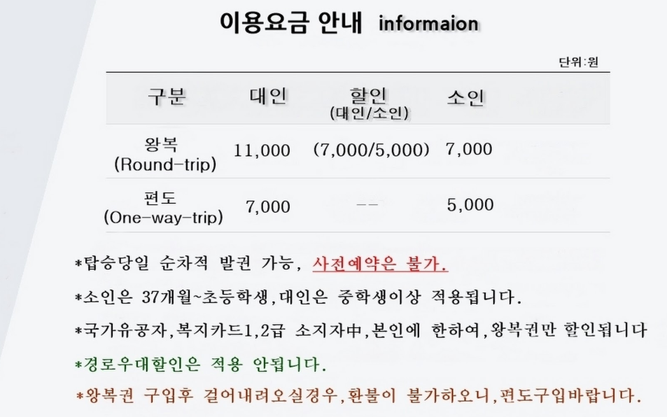 - 요금 (왕복 기준): 성인 약 8,000원, 소아 약 5,000원 (편도 요금도 가능)