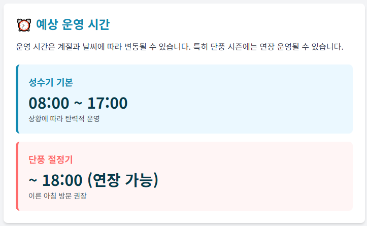 - 성수기 기본 운영 시간: 보통 08:00 ~ 17:00