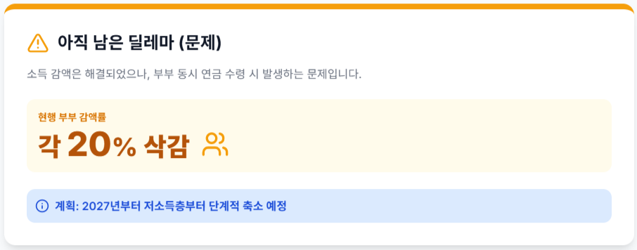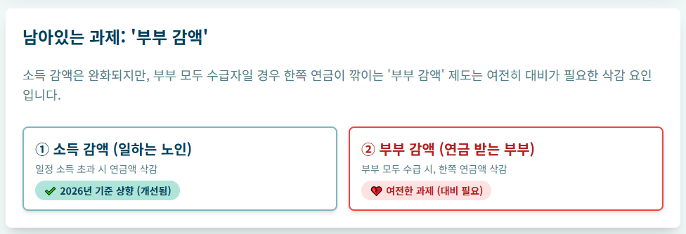 소득 감액은 해결되었지만, 노령연금 수급 부부가 함께 연금을 받을 때 각자 20%씩 깎이는 **'부부 감액 제도'**는 여전히 남아있는 딜레마입니다.