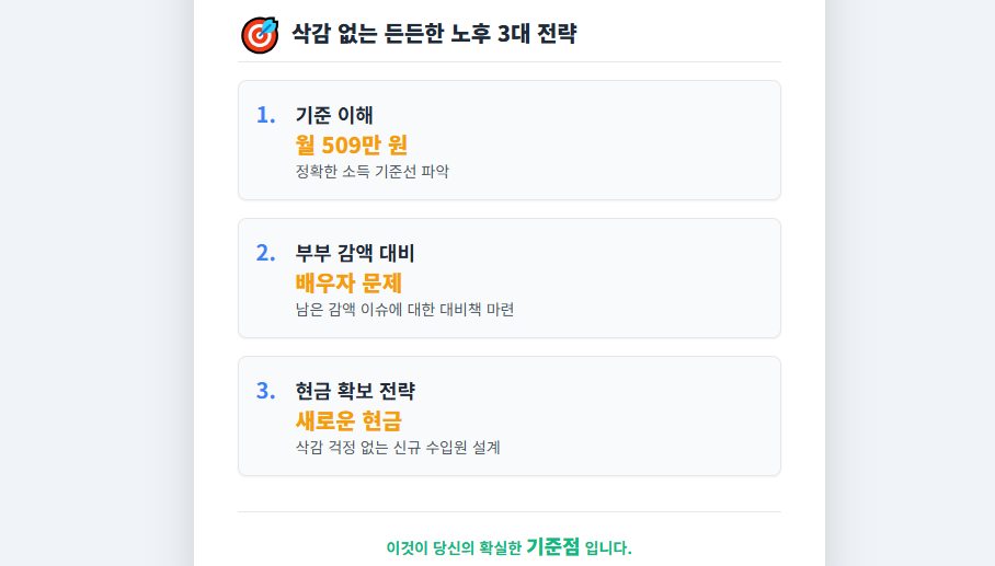 🔥 결론: 이제 월 소득 509만 원 미만의 근로자(대다수 은퇴자)는 **연금 삭감 걱정 없이** 소득 활동을 지속할 수 있습니다. 삭감 딜레마의 가장 확실한 해법입니다.