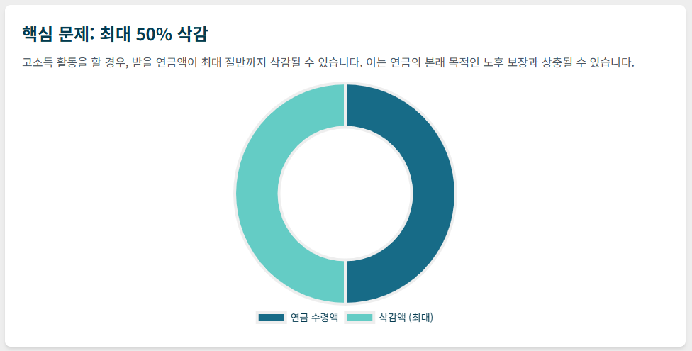 삭감 기준은 전체 가입자 평균 소득인 'A값'에 묶여 있었습니다. 이 기준선이 낮았기 때문에 웬만한 소득 활동만 해도 연금이 깎였으며, 삭감액은 **최대 50%**에 달했습니다.