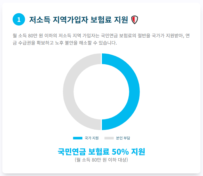 월 소득 80만 원 이하의 저소득 지역 가입자는 국민연금 보험료의 절반을 국가가 지원받게 됩니다. 이는 연금 수급권을 확보하지 못해 노후가 불안한 분들에게 실질적인 혜택입니다.
