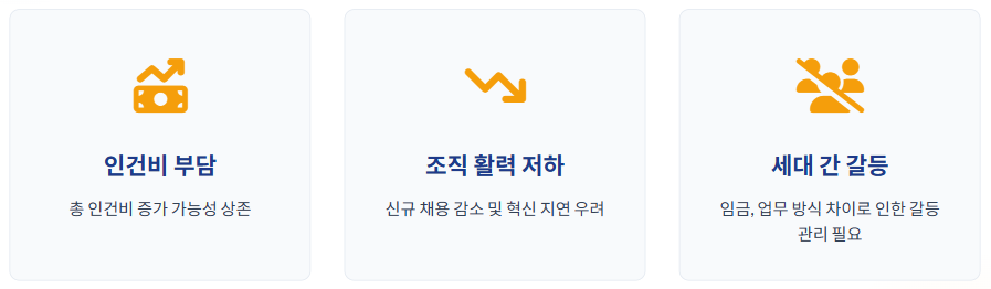 - 세대 간 갈등 및 조직 문화 관리: 임금 감액에 따른 불만, 세대 간 업무 방식 차이 등으로 인한 갈등 관리 필요.