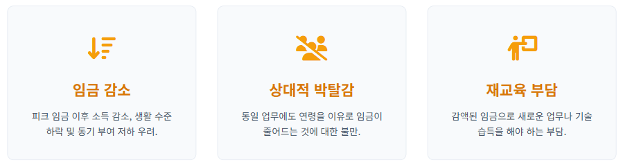 - 임금 감소: 피크 임금 이후 소득이 줄어들어, 생활 수준 하락 및 동기 부여 저하 우려.