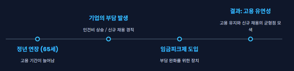 정년 연장과 임금피크제는 각각 다른 목적을 가지고 있지만, 기업의 인건비 부담과 고용 유연성 확보라는 교집합에서 강하게 연결됩니다.