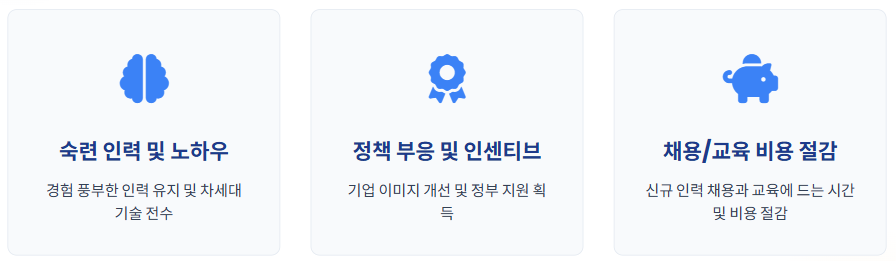 - 숙련 인력 유지 및 노하우 전수: 경험이 풍부한 근로자를 통해 생산성을 유지하고, 젊은 세대에 기술을 전수 가능.
