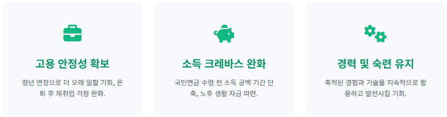 - 고용 안정성 확보: 정년 연장으로 더 오래 일할 수 있는 기회 제공, 특히 은퇴 후 재취업 걱정 완화.