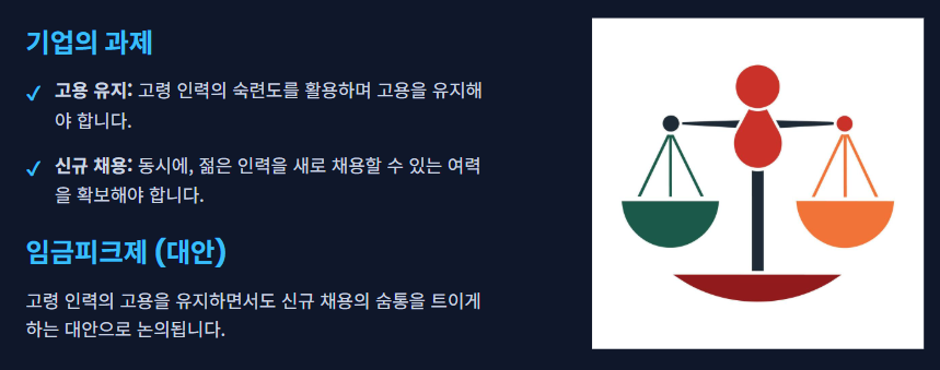 기업은 고령 인력의 고용을 유지하면서도, 젊은 인력을 새로 채용할 수 있는 여력을 확보해야 합니다. 임금피크제는 고령 인력의 숙련도를 활용하면서도 신규 채용의 숨통을 트이게 하는 대안으로 논의됩니다.