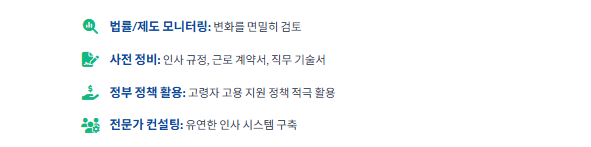 법률 및 제도 변화를 면밀히 모니터링하고, 인사 규정, 근로 계약서, 직무 기술서 등을 사전에 정비해야 합니다. 정부의 고령자 고용 지원 정책을 적극 활용하고, 유연한 인사 시스템 구축에 대한 컨설팅을 받는 것도 좋은 방법입니다.