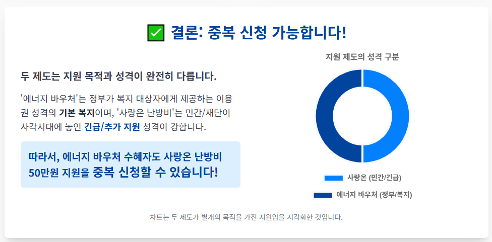 ✅ 결론: 두 제도의 지원 목적과 성격이 달라, 에너지 바우처 수혜자도 사랑온 난방비 50만원 지원을 중복 신청할 수 있습니다. 병행 신청으로 부담을 크게 줄이세요!