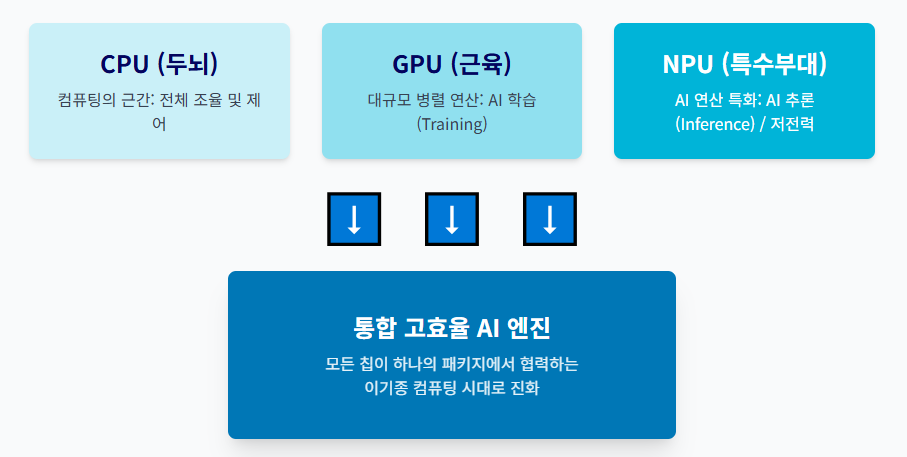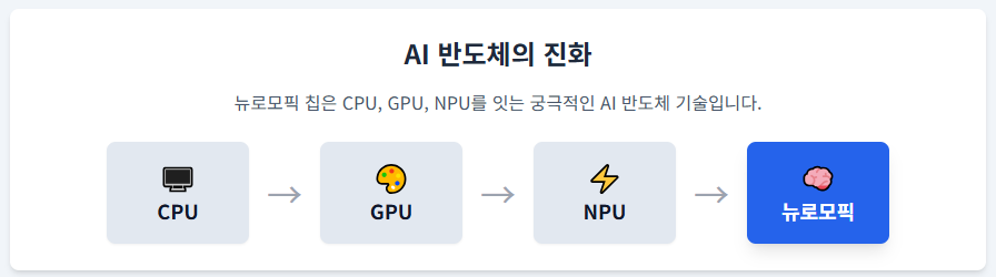특징: 뉴로모픽 칩은 뇌처럼 정보 처리와 저장을 동시에 수행하여, 현재 NPU보다도 훨씬 **적은 에너지**로 복잡한 AI 작업을 수행할 수 있습니다. 이는 한국 기업들도 연구 개발에 박차를 가하고 있는 분야입니다.