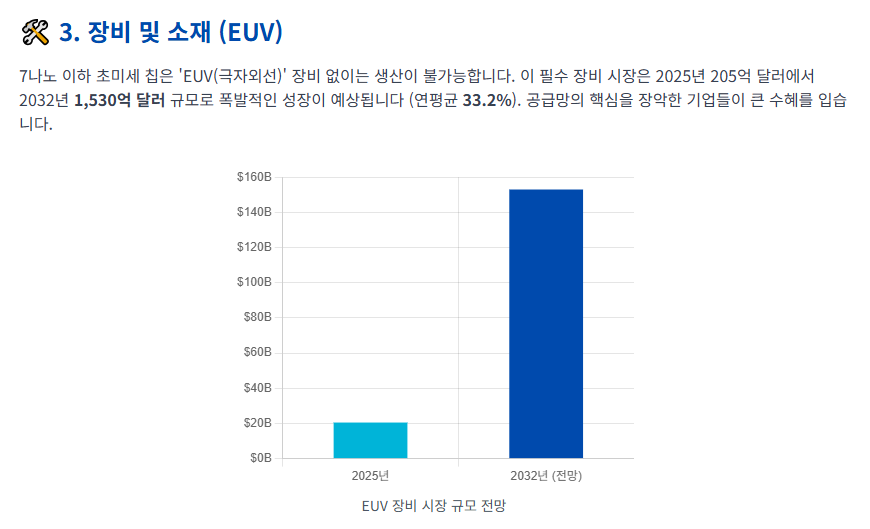 - **장비 및 소재 산업:** 미세한 칩을 만들기 위한 **극자외선(EUV) 노광장비**나 특수 소재를 공급하는 기업들은 반도체 호황기에 항상 수혜를 입습니다.