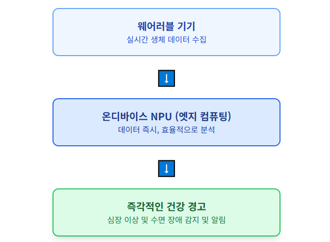 미래에는 이 칩들이 개인 건강 관리에 깊숙이 들어옵니다. **NPU**는 스마트 워치나 웨어러블 기기에서 실시간으로 생체 데이터를 분석해(온디바이스 AI, 752번 글 참고) 심장 이상이나 수면 장애를 즉시 감지해 줄 것입니다.